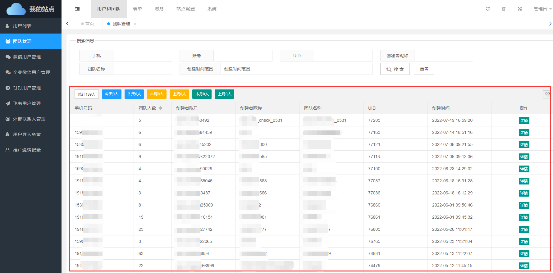 团队管理列表所展示的都是系统内已存在的团队的具体信息,通过团队管理,管理员可快速掌握平台内注册的团队情况。