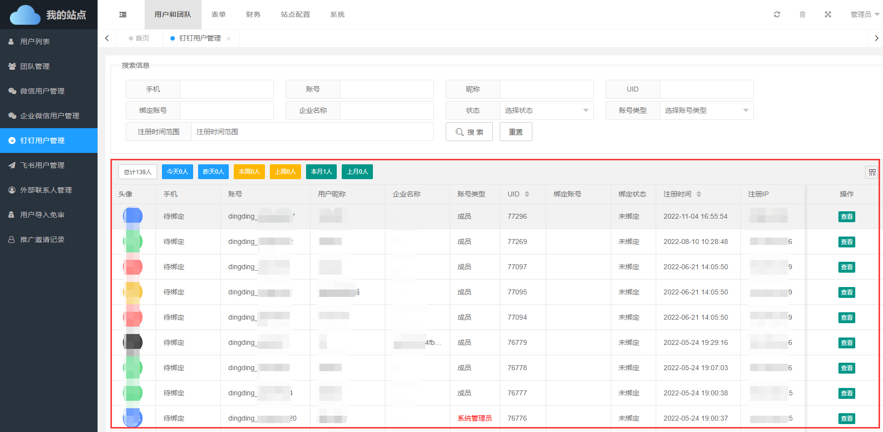 已绑定、未绑定, - 注册时间:钉钉用户注册时间