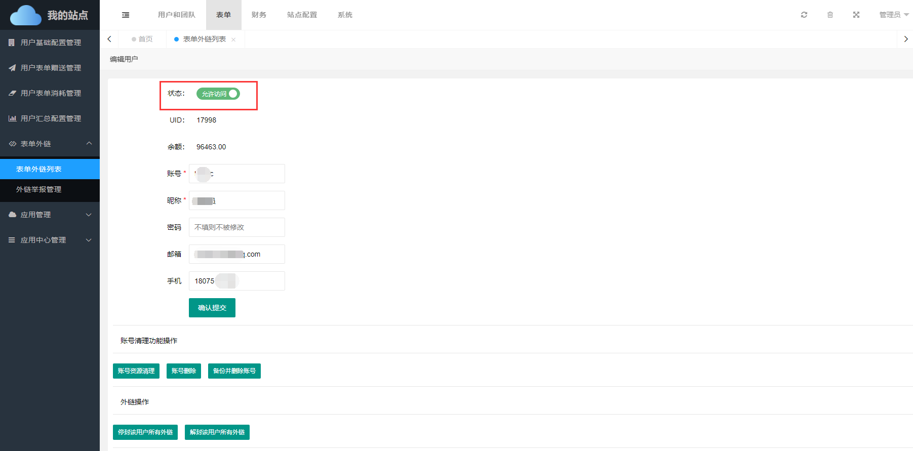 封停账户 不仅可以封停该用户所有外链还可以封停当前账号,除此之外,在本页面还支持解封账户、解封该用户所有外链。