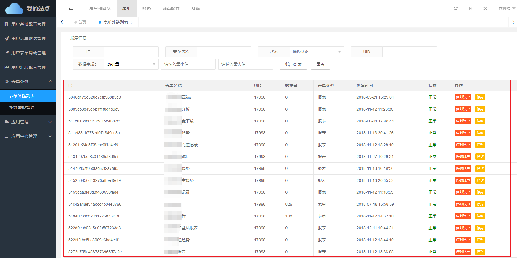 表单外链列表中,展示所有已发布的表单以及开启的外链列表,在这个列表中,可以对所有外链进行集中管理