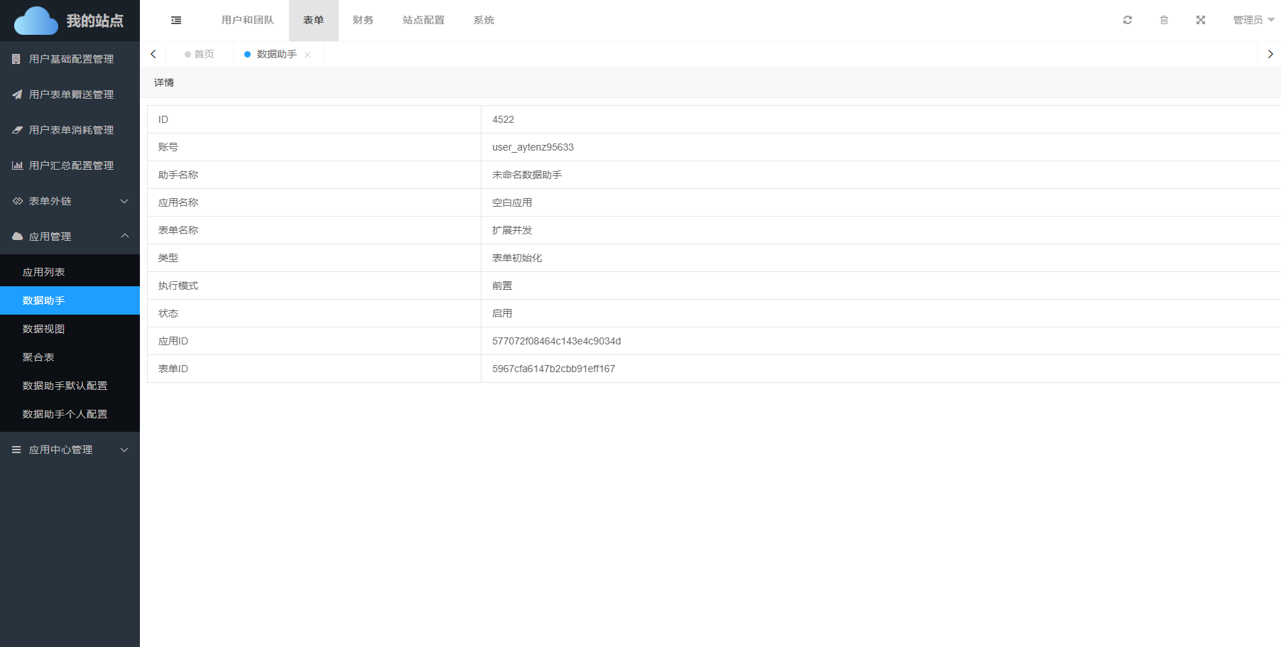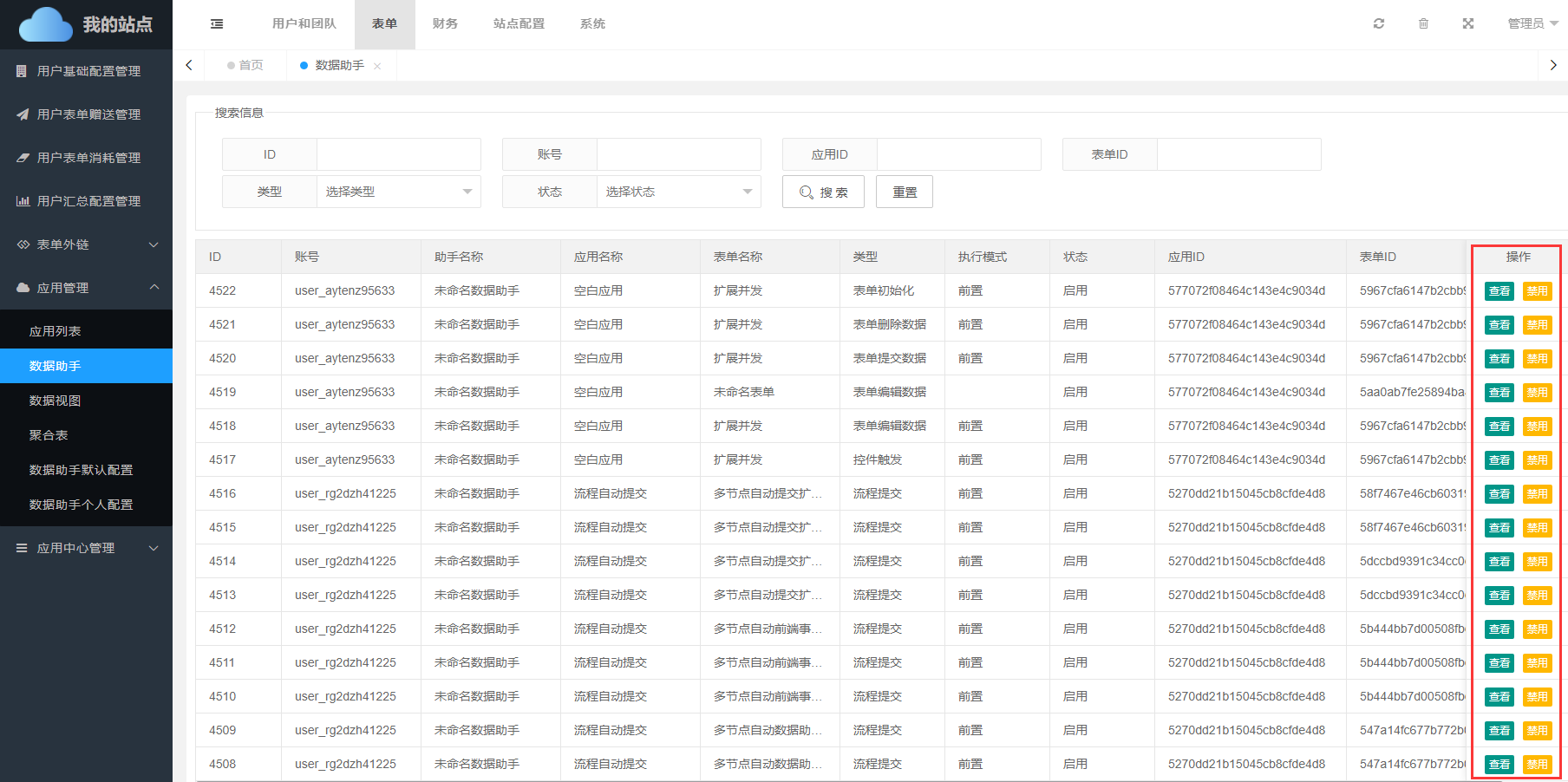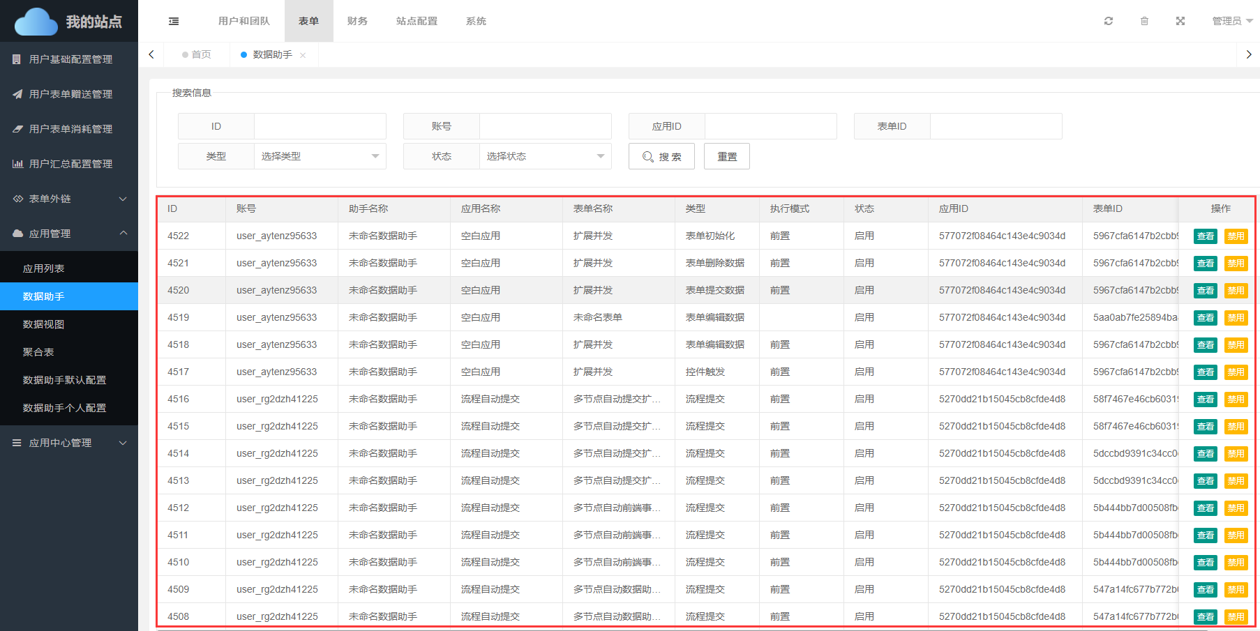 数据助手是表单系统中非常重要的特色功能,通过数据助手,可以实现许多通过表单自身无法实现的功能,本页面可以对站点内所有数据助手进行管理。