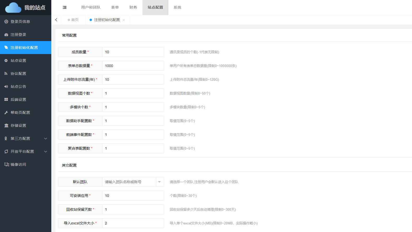 • 成员数量: 新用户注册后,其创建的团队,最大人数限制