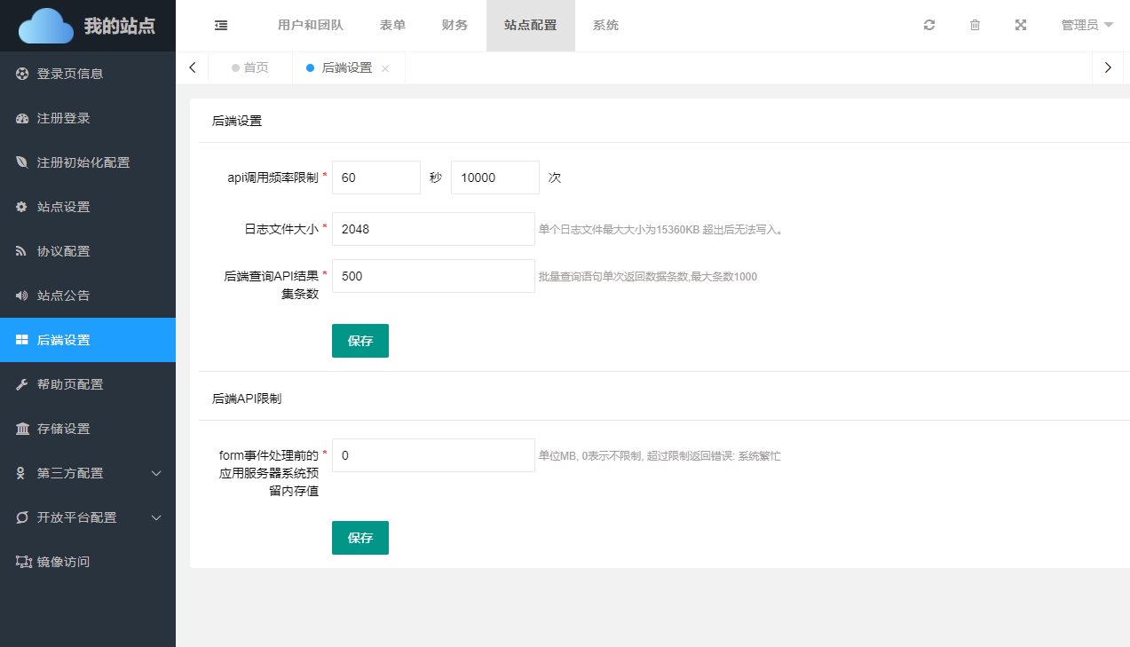 平台的后端体系相关参数可以在本页面进行设置。