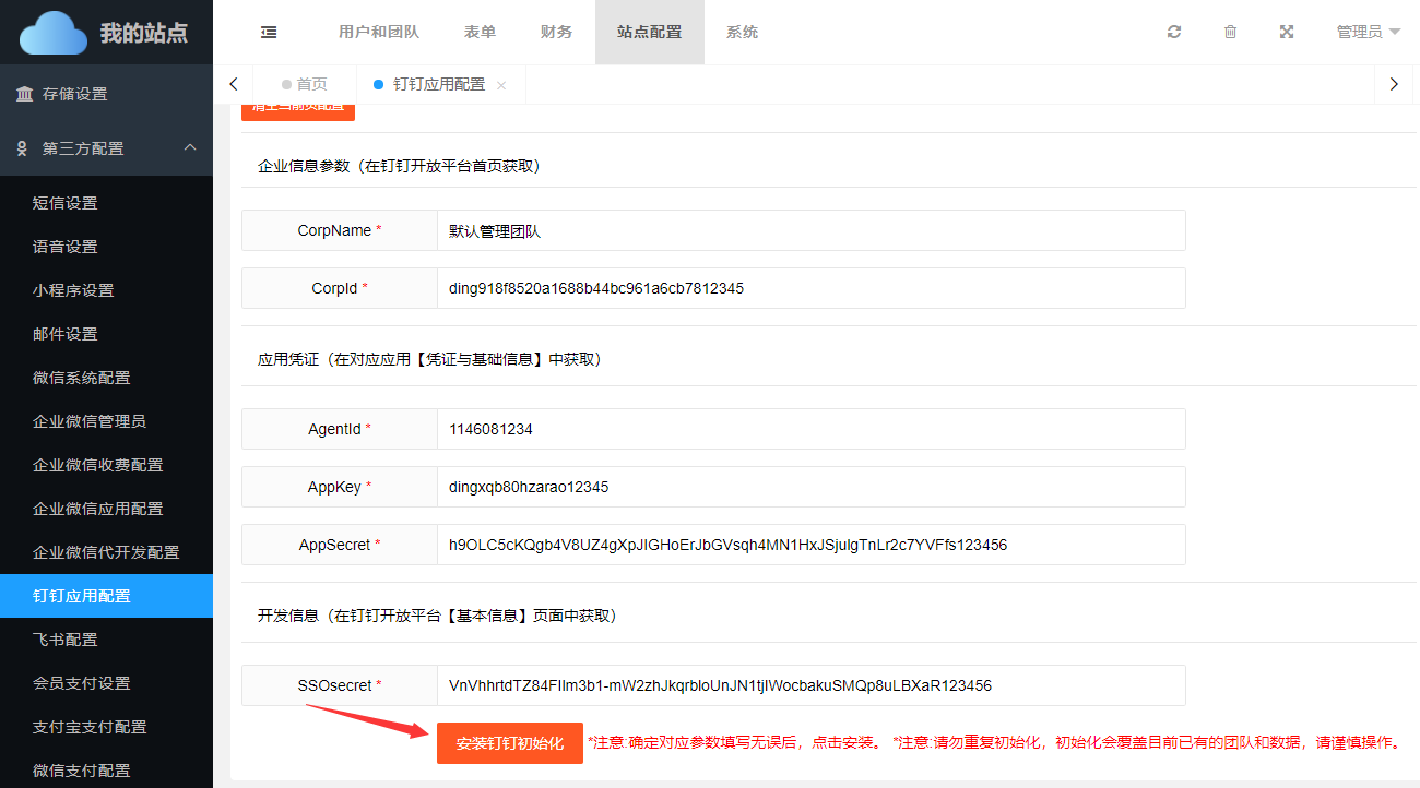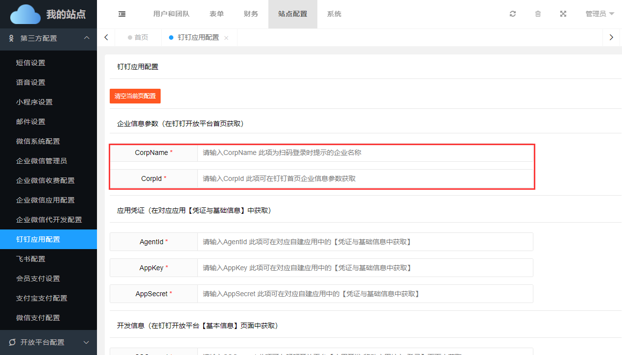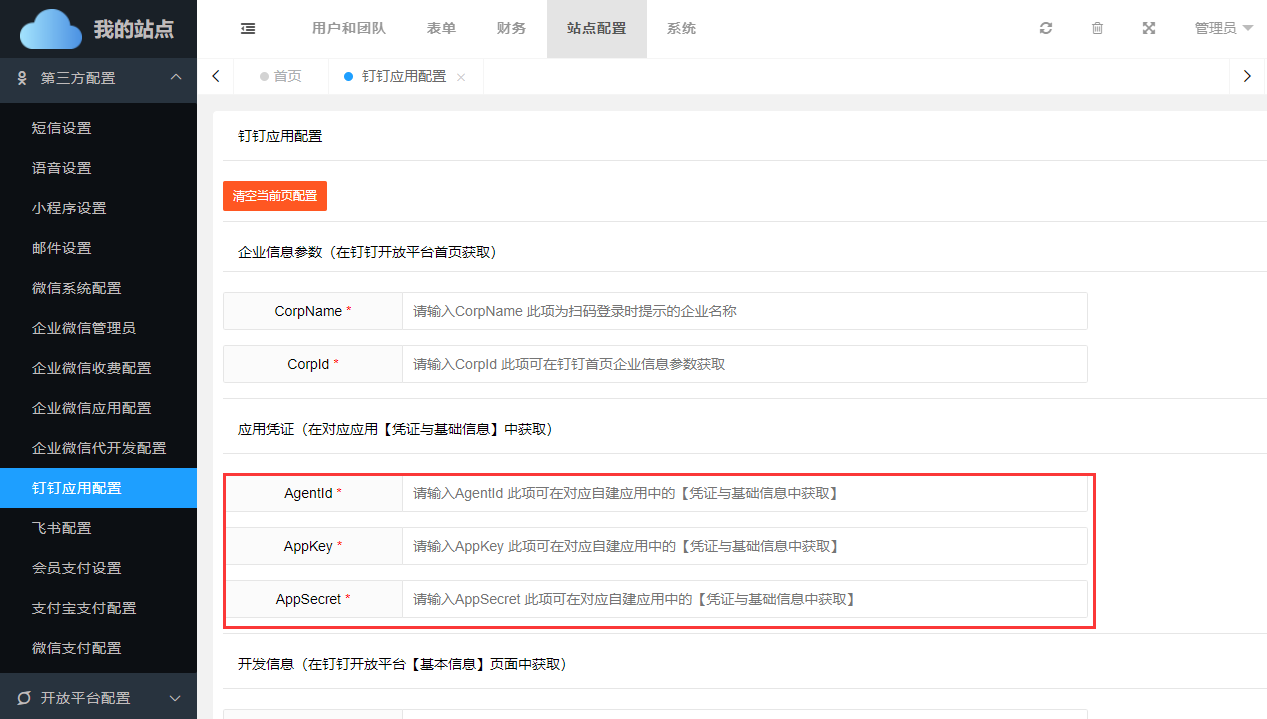 如需对接钉钉办公,还需要在【站点配置】->【第三方配置】->【钉钉应用配置】中正确填写绑定参数。