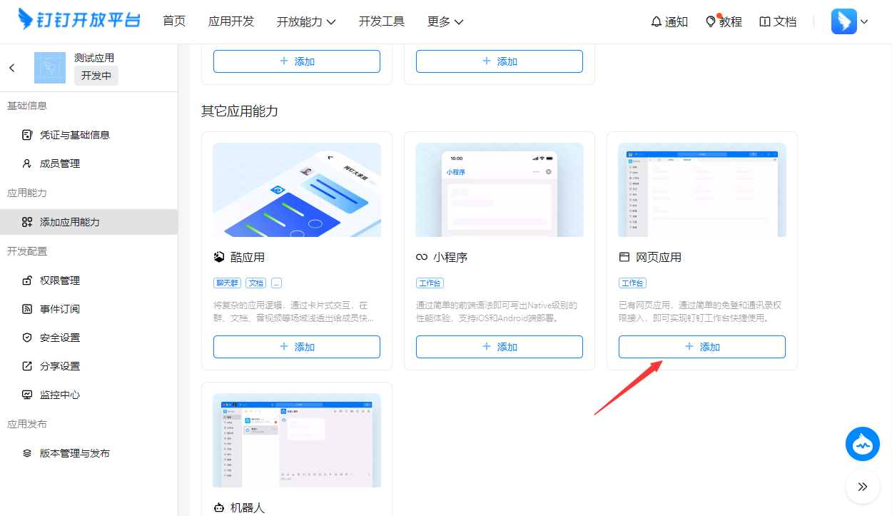 填写完应用凭证后添加网页应用能力,并将如下信息填写正确;
