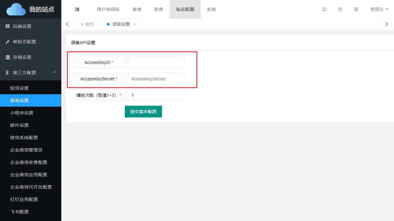 填写到平台管理后台中站点分类下语音服务页面
