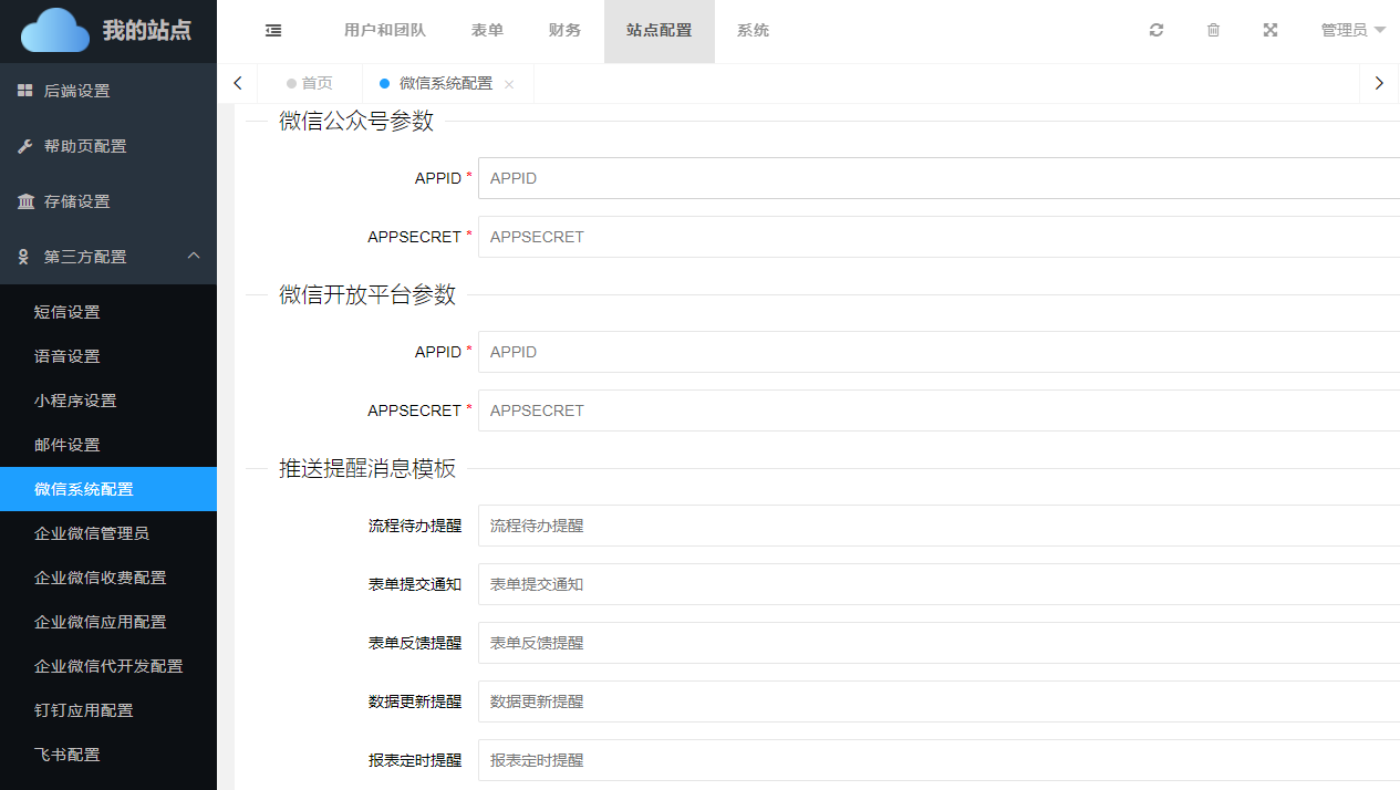 进入私有云后台后,在站点配置->第三方配置->微信系统配置中 填写相应的参数信息。