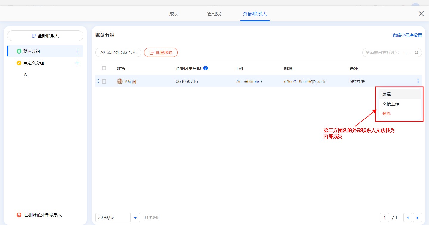 第三方团队的外部联系人,不支持内部成员和外部联系人直接的身份转换。