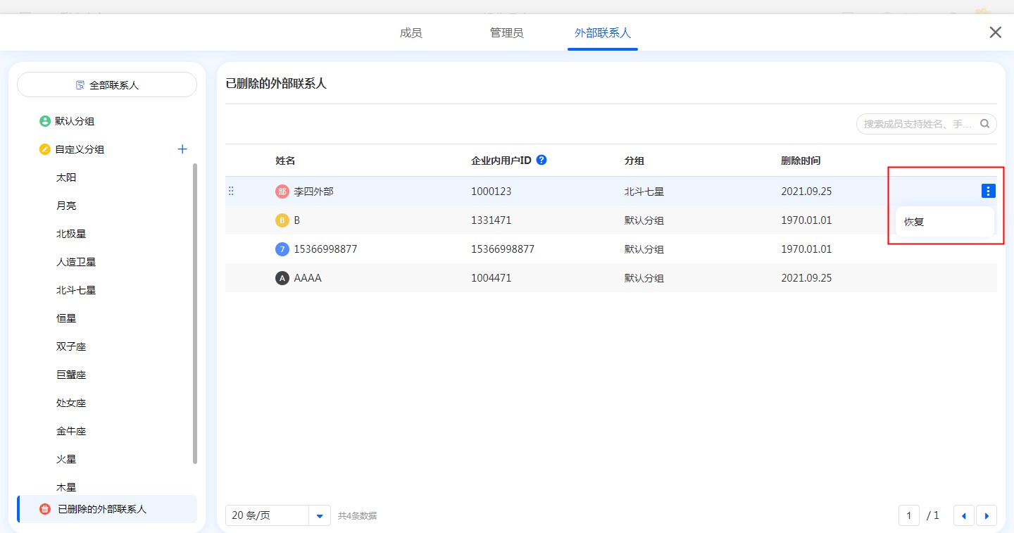 已删除的外部联系人支持恢复。