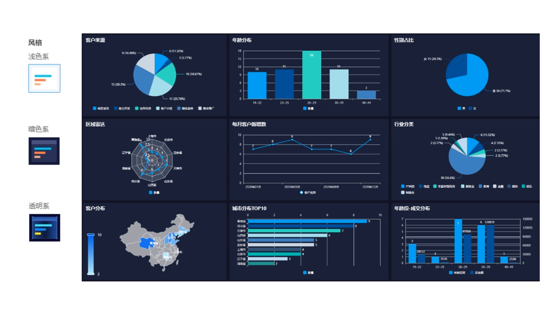 可对现有报表进行编辑,通过分析报表整体样式设置可以快速完成仪表盘视觉风格的转换。市面上酷炫的报表看板制作过程较为复杂,而百数不仅对于单个组件的特殊展示需求支持单独配置,也支持快捷设置报表整体风格,风格一键即可切换。