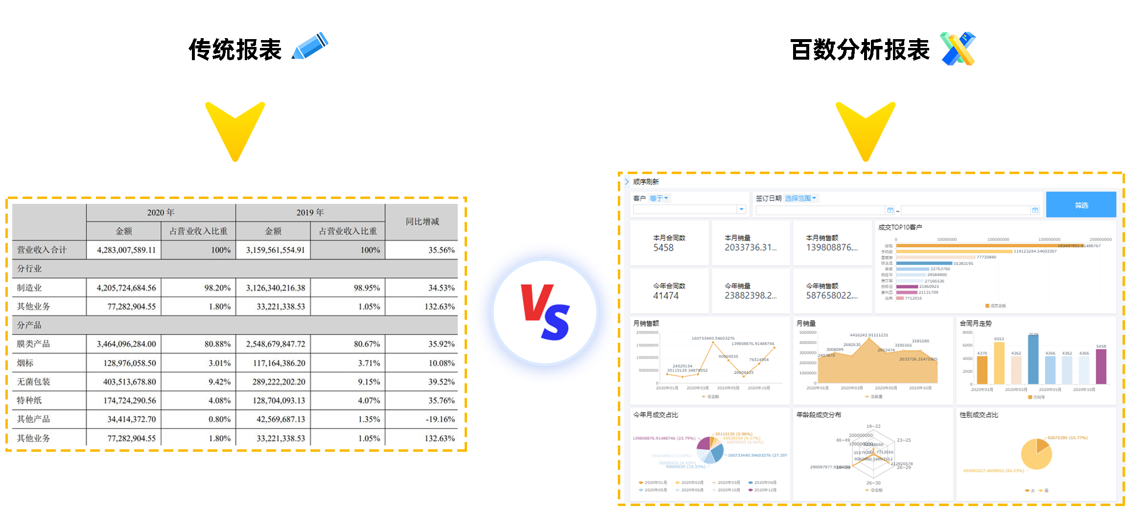 传统报表平台在做海量数据查询分析时,响应很慢,花费了大量IT与业务的人力资源而且无法自动更新展示最新的数据。而通过百数0代码鼠标拖拽式操作就可实时展现更新的数据报表,并定期推送,让业务人员也能轻松实现海量数据可视化分析。