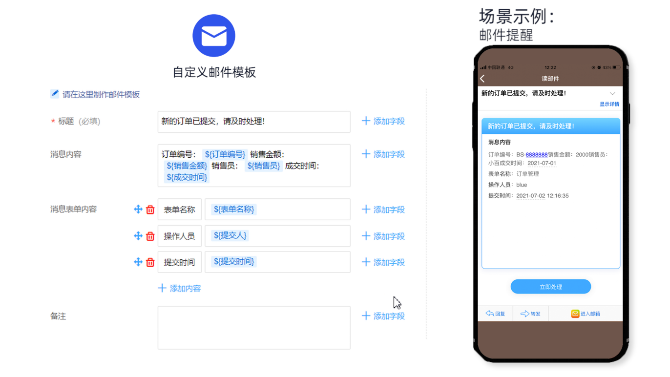 「推送提醒」提供七种消息推送渠道,可以设定以企业微信、微信、钉钉、飞书、短信、语音、邮件多种推送渠道提醒用户,并且不同的提醒方式可以自定义其消息模板,企业可以根据自己所属账号模式来设置对应的提醒样式及内容。 如:在使用流程催办功能时,配置好语音消息模板,这样就可以以语音的方式催办流程负责人,及时处理流程。