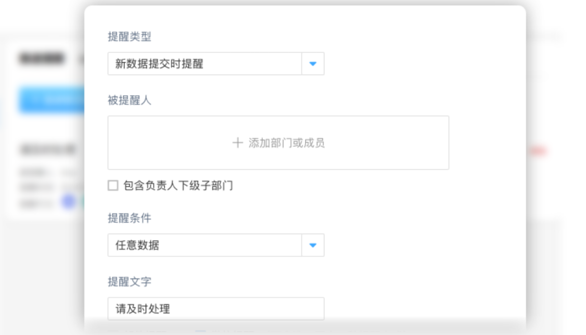 「推送提醒」可以设置指定时间/方式/数据/提醒人,即在什么时候、把哪些数据、用何种方式、提醒给谁,被提醒人可以设置成表单内的成员控件或部门控件,且可以设置重复周期,比如员工生日提醒一年提醒一次,被提醒人可以是行政部或人事部等。发送类型/对象/快慢皆自由设定,此外还可以自己填写提醒的文字内容,是一种完全由你掌控的提醒方式。