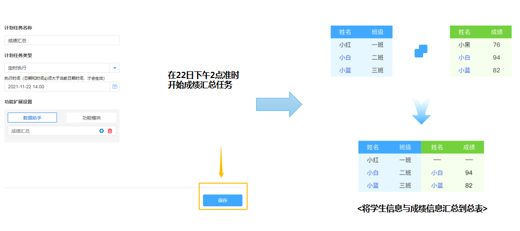 以家校管理中的学生成绩汇总为例,学生每个学期不同类型考试的成绩汇总,需要操作大量的数据表单,在百数通过计划任务功能配合数据助手,能够有效为老师减负。