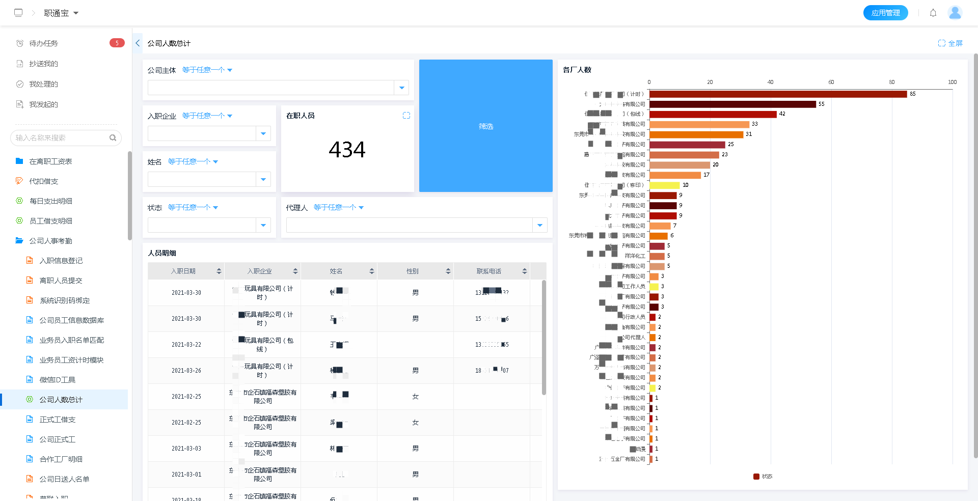 3、利用百数的报表体系,实时统计所辖企业的在职人员、离职人员、人员入职渠道以及各种与人事相关费用的申报、使用、管理情况。所有款项收支,无论是明细还是汇总分析,借助多样化报表展示一目了然。