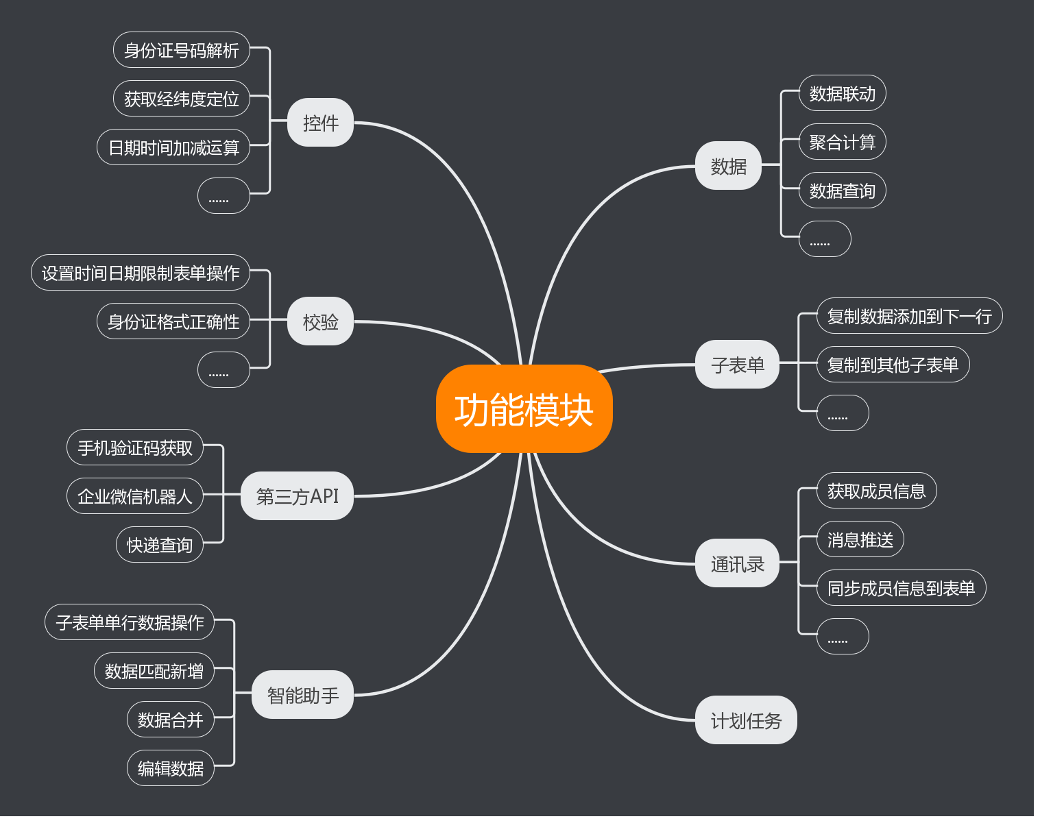 功能插件对于百数基础功能的辅助升级体现在表单控件能力的扩展、复杂多表的复合计算、第三方对接等多个系统维度,应用场景丰富,能够全方位渗透式的为定制化业务场景服务。