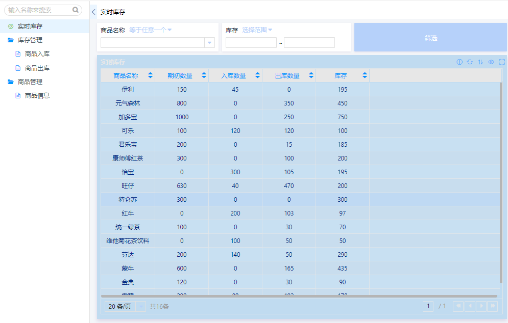 以根据商品名称,汇总入库数据和出库数量来计算库存为操作示例: