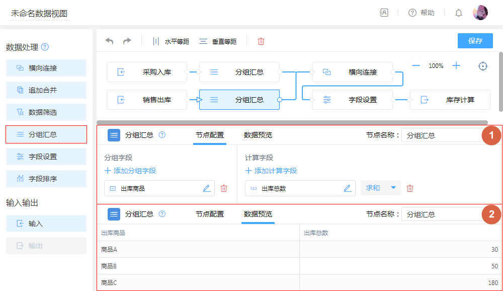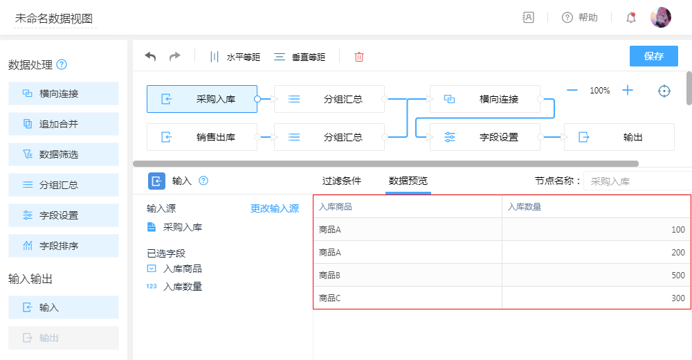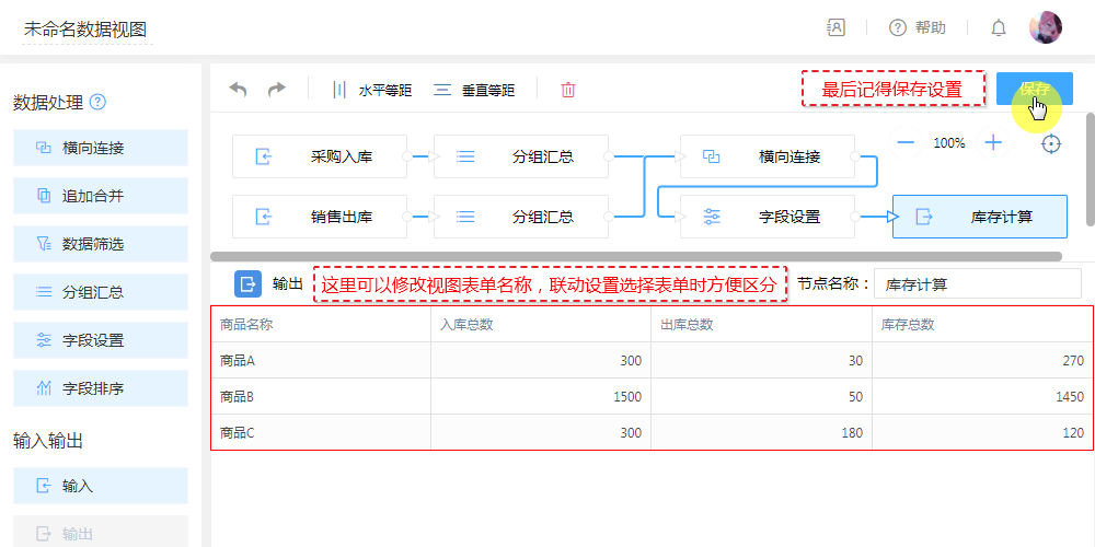 第三步:拖入字段设置添加计算字段,无需复杂的函数,在弹出的编辑框拖拽即可轻松编辑计算公式,以便对传入的数据进行公式计算。即可通过“入库”总数与“出库”总数,计算出最新剩余库存。