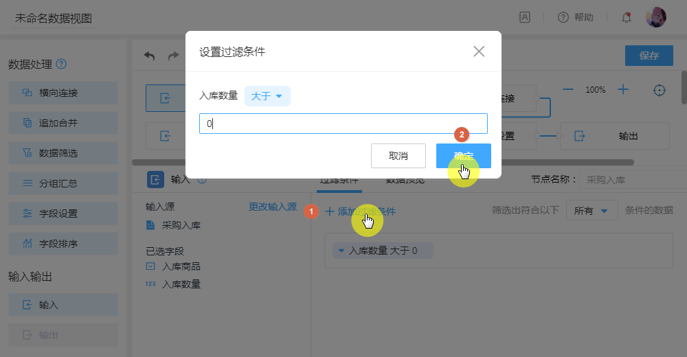 2.添加“过滤条件”,可以自定义设置固定内容为条件,用于筛选符合条件的数据传入数据视图使用。如筛选入库数量大于0的数据。