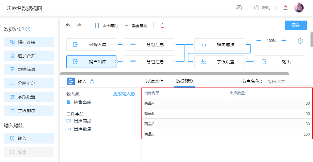 第四步:连线输出节点,可以展示视图最终处理后的数据。此输出表也方便提供其他表联动调用或报表使用。