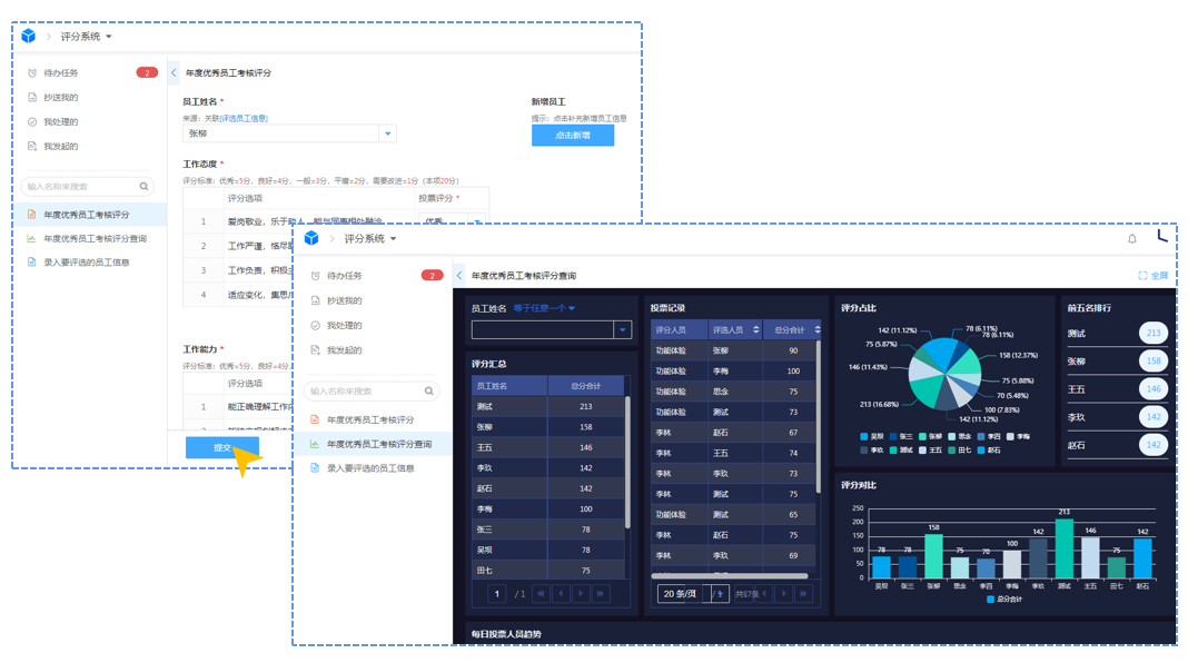 应用示例 1.评分系统——评分提交跳转评分汇总查询 提交评分意见后,将自动跳转到评分查询汇总表查看当前投票情况