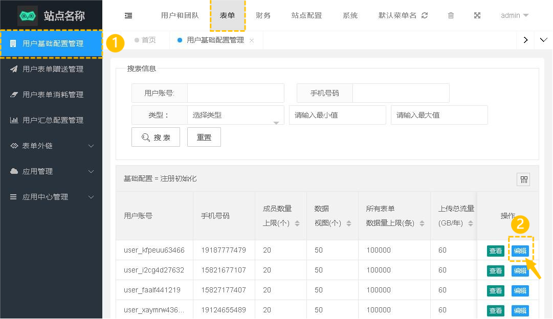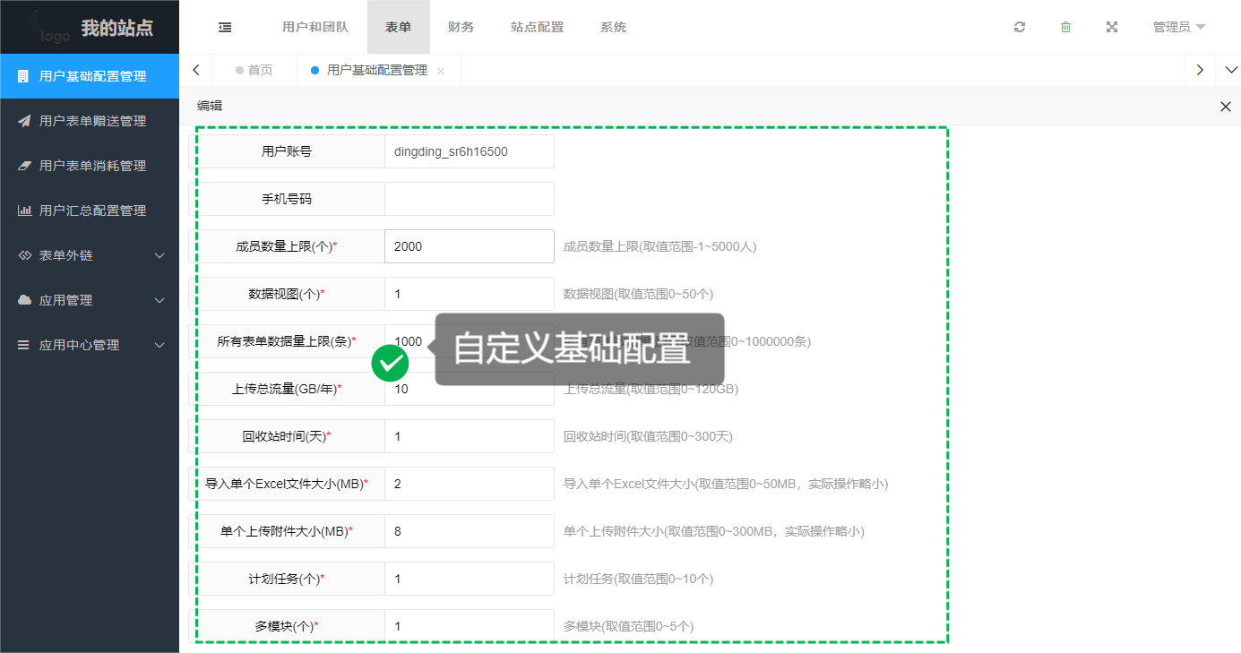 *永久配置性能,适用于企业自用 管理员登录后台—[表单]—[用户基础配置管理]这个分类下,可以查看和管理所有用户的基础配置情况。编辑需要配置的用户账号进行自定义配置,提交后该用户账号不受任何限制,永久使用配置的性能,适用于企业自用型。