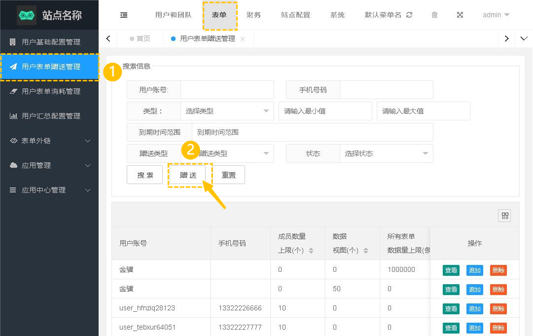 方式2. 用户表单赠送管理