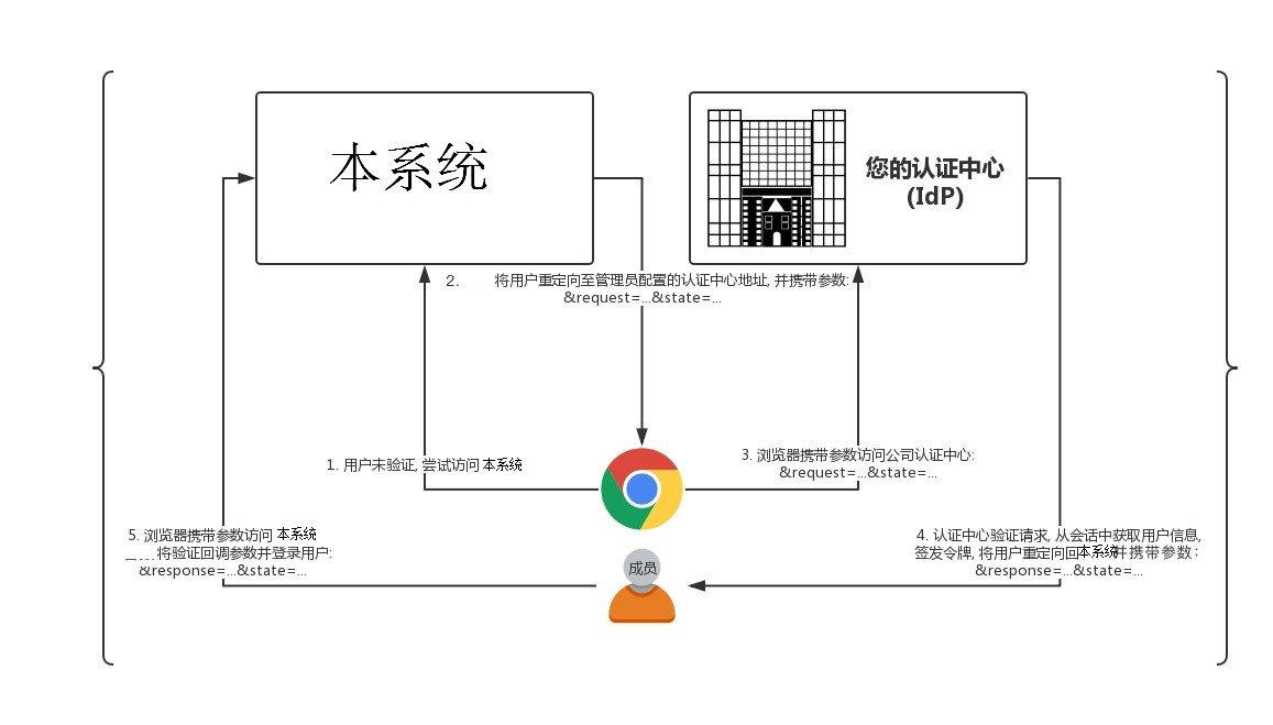 基于配置的 IdP 信息, 客户需要开发自己的 IdP来与本系统对接以实现单点登录. 用户 IdP 的作用可从下图中体现: