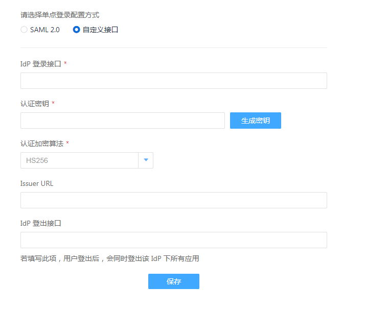 自定义接口的整体配置与 SAML 2 类似, 只是支持的加密算法与密钥的形式存在差异, 在 SAML 中我们支持 SHA 系列算法, 而自定义接口中我们支持 HMAC-SHA系列算法。在 SAML 中我们要求用户填写包含公钥的基于 X.509 格式的证书, 而在自定义接口中需要填写的是一个普通的密钥字符串, 长度最大为 128。