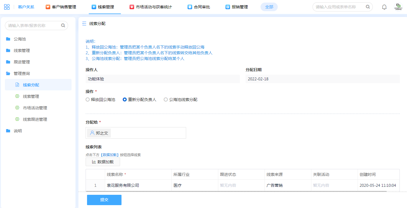 方便商务部门负责人进行线索分配以及动态管理,操作包括将线索释放回公海、重新分配负责人、公海池线索分配等。