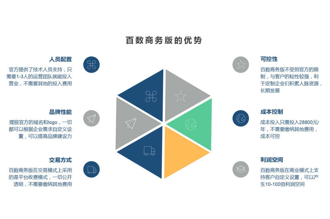 百数商务授权模式提供独立平台,平台上的域名、logo、名称都支持自定义,包括后期更新与维护都能选择自主还是第三方,在保密性上每个公司使用的服务器或存储应用都是单独的,用户拥有绝对的控制权。