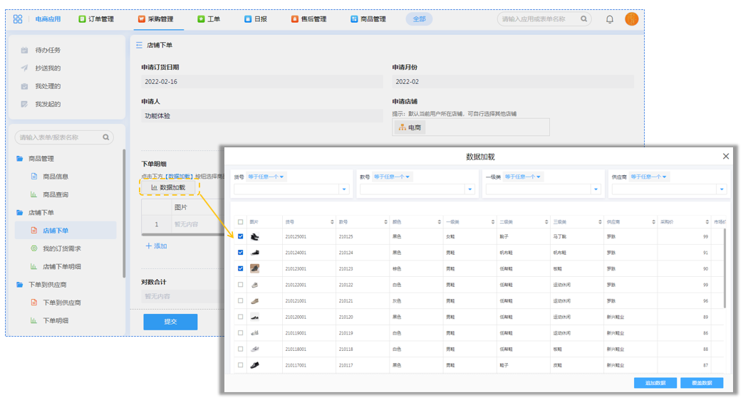 店铺采购下单,下单明细可以通过数据加载功能直接在商品信息列表中勾选,减少重复的手动录入操作。