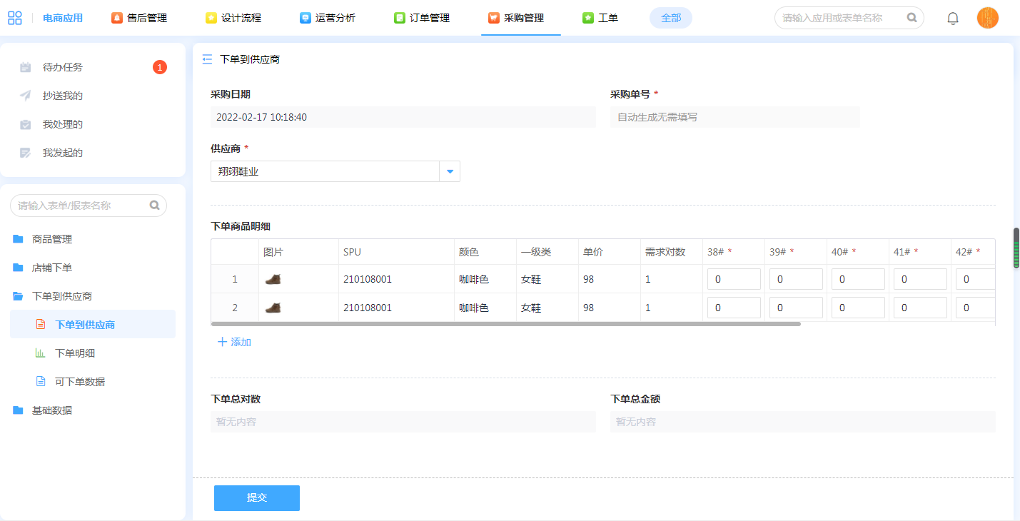 平台下单到供应商,选择供应商名称即可自动匹配相关商品参数明细,修改数量即可提交下单内容。