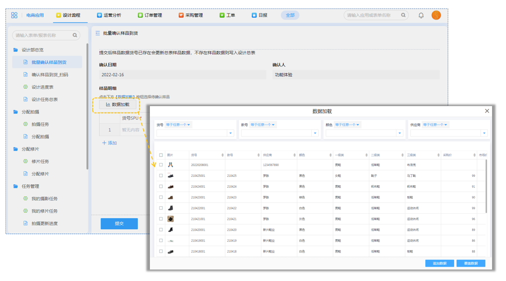 借助表单数据加载,可以大批量确认处理到货商品信息。提交确认的商品将进入到设计任务总表等待分配设计任务。