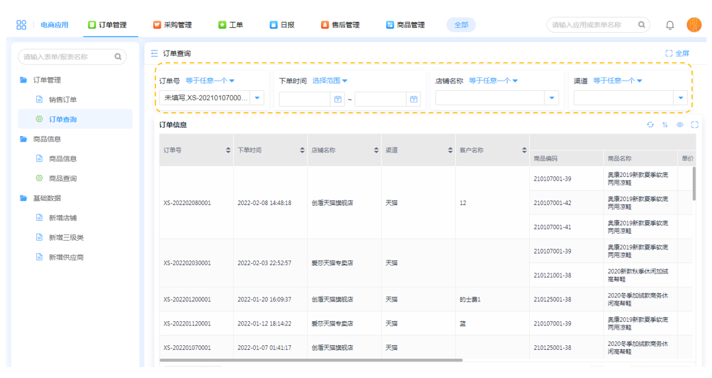 在线报表通过关键词筛选,在海量的订单信息中也能方便快捷地找到相应的信息数据。