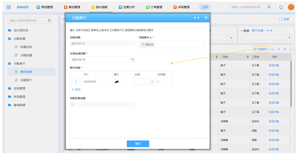 确认到货的样品自动汇总到修片任务表后,可勾选商品信息一键分配修片任务到制定设计师。