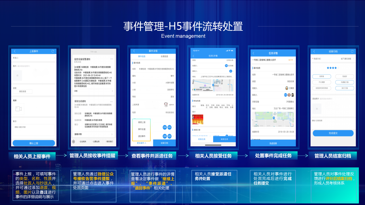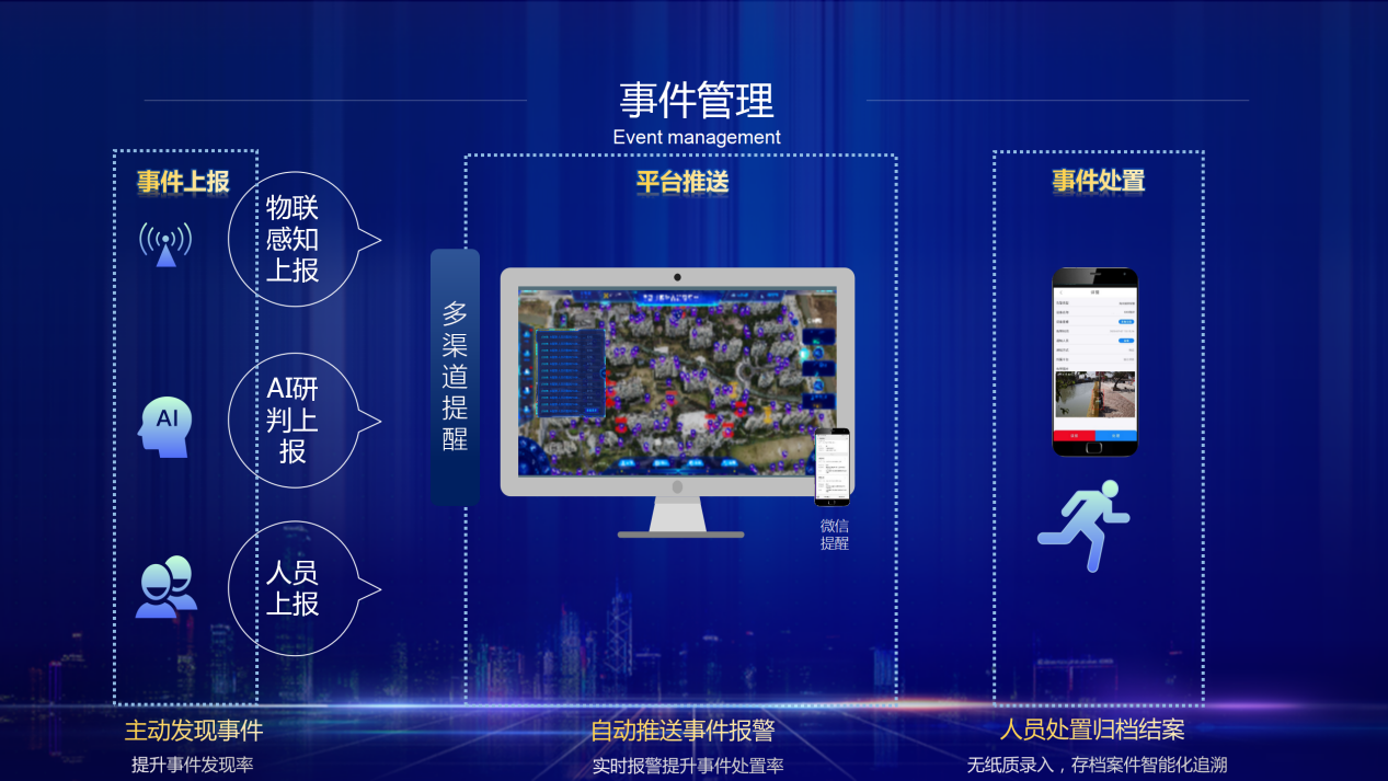 多渠道提醒上报,统一数字化管理,有效实现: 1.提升事件发现率 2.实时报警提升事件处置率 3.无纸化录入,存档案件智能化追溯
