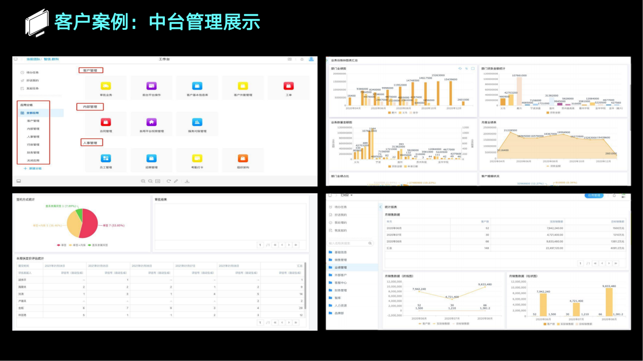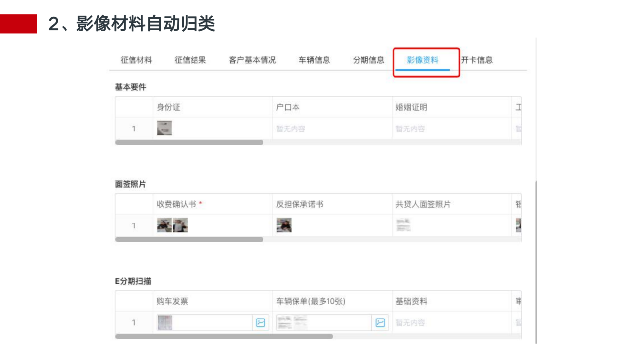 1.快速 全电子化流程操作,移动办公,自动化智能审批,从T+10缩减到T+0。 2.体验 客户经理、审批人员、合作机构、客户的业务体验大幅度上升,借助科技手段优化人工操作,极大程度减少劳动力。 3.决策 全面的报表系统、运营分析平台,融入丰富的行业运营经验,为决策提供更高 的前瞻性。 4.整合 整合机构、数据平台、卡系统、核心系统等行内、行外多端系统及资源,集中在一个系统管理。 5.风控 全方位的客户画像、交易风险识别 、机构管控、贷后监控,为分期业务全生命周期保驾护航