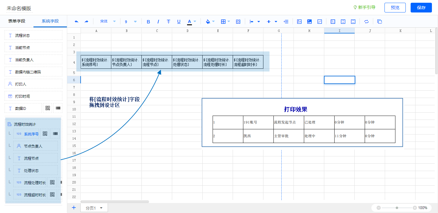• 在线模板设计时将[流程时效统计]字段拖动到具体位置即可