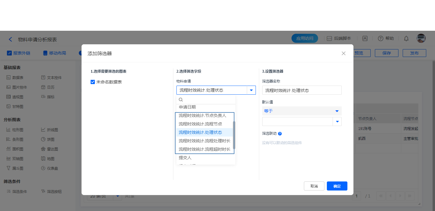 • 报表筛选条件设置[流程时效统计]字段