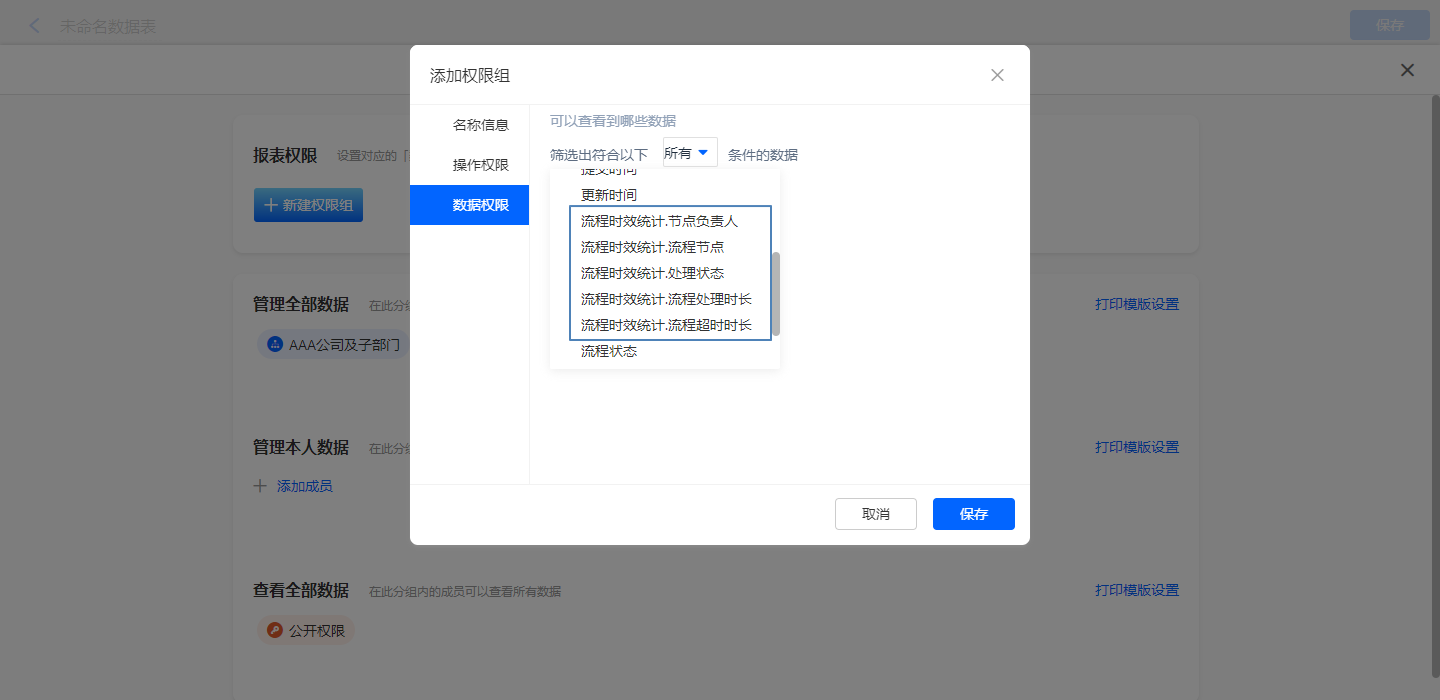 • 报表自定义权限组,数据权限设置[流程时效统计]字段