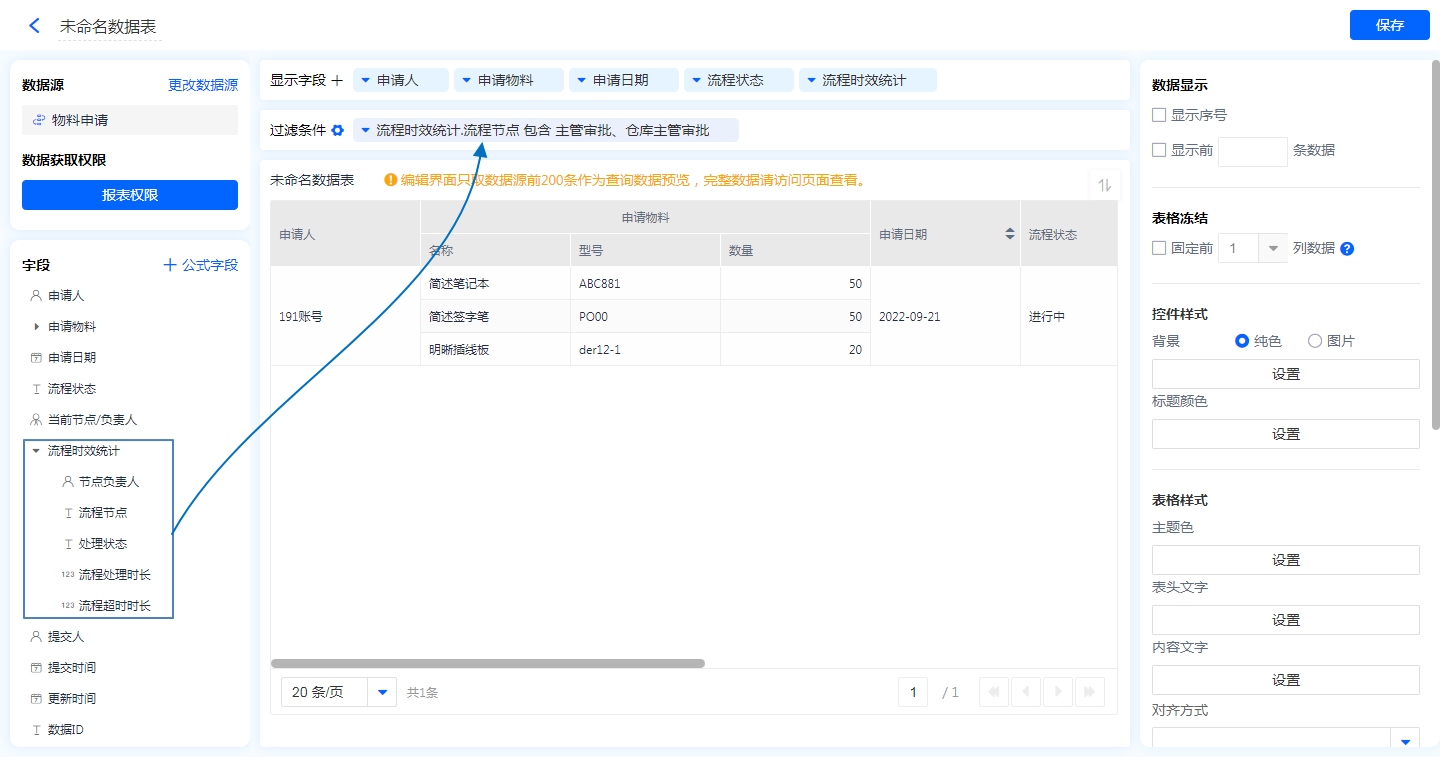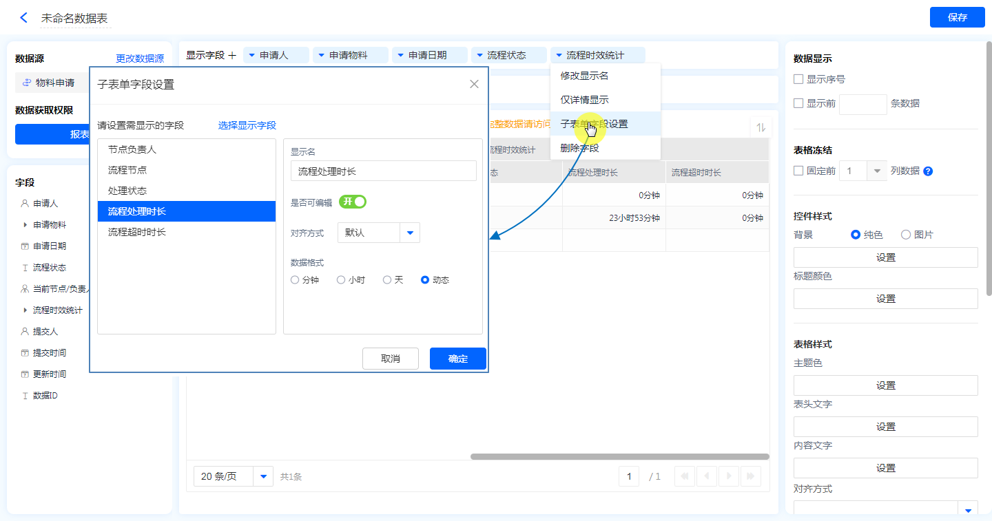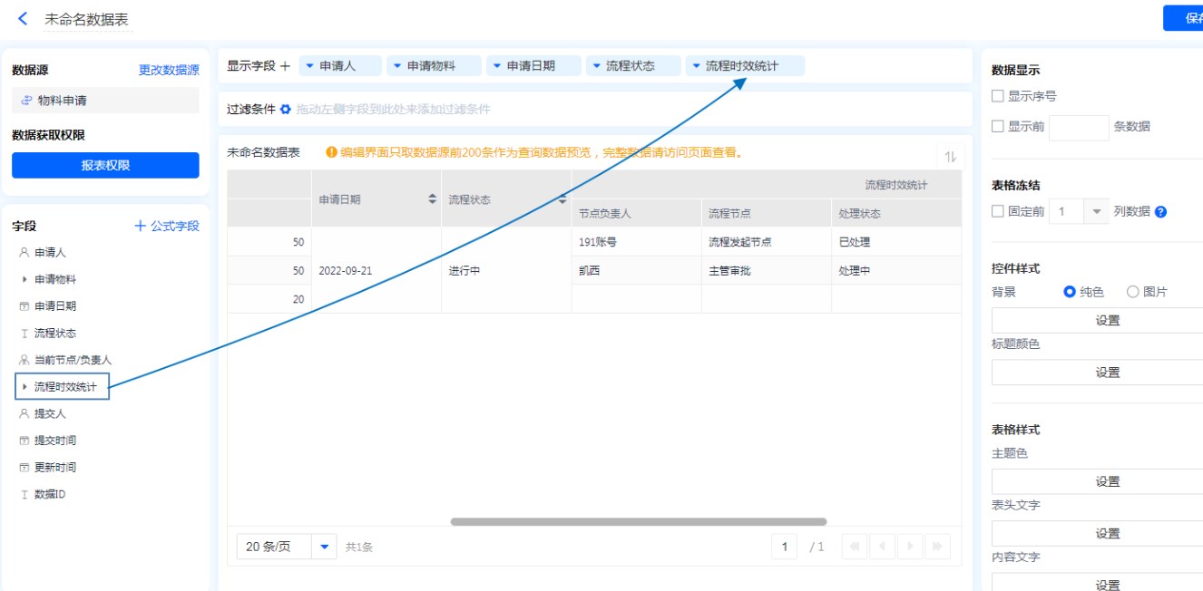 系统将[流程时效统计]作为一个系统子表单字段,在报表中可以查看并使用。