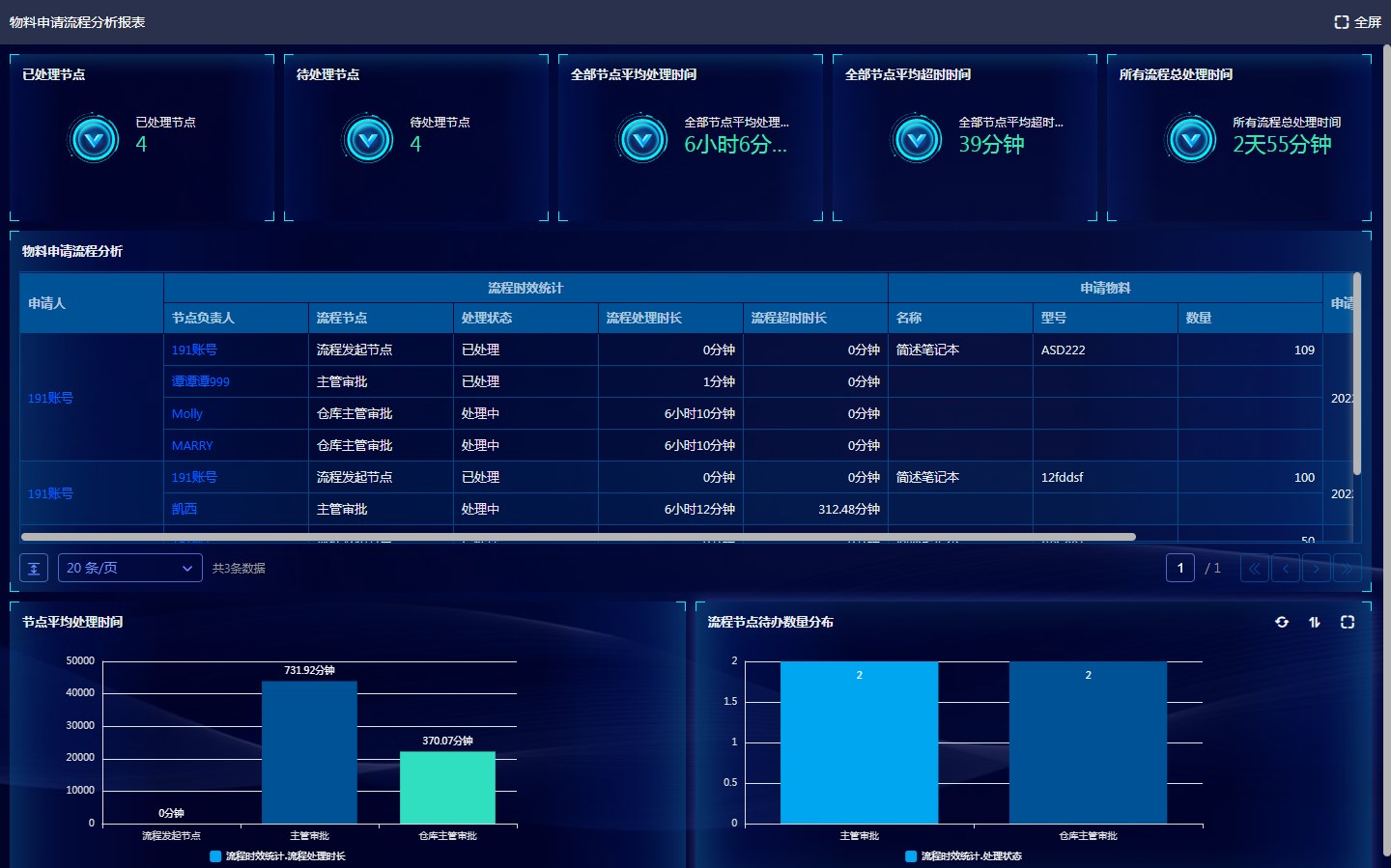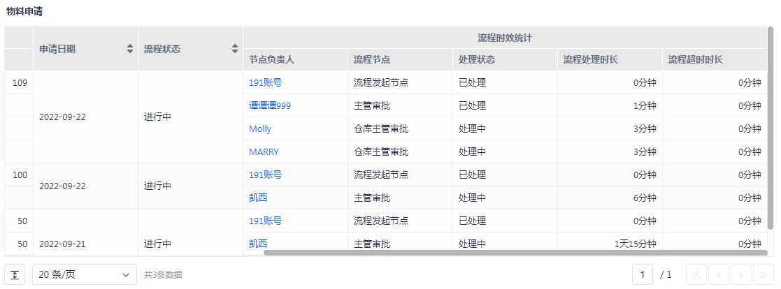 流程时效统计功能是针对 流程节点、节点负责人、流程节点处理状态、流程处理时长、流程超时时长 等进行数据统计和分析,可以对流程运作情况、员工工作表现等方面提供数据支撑。