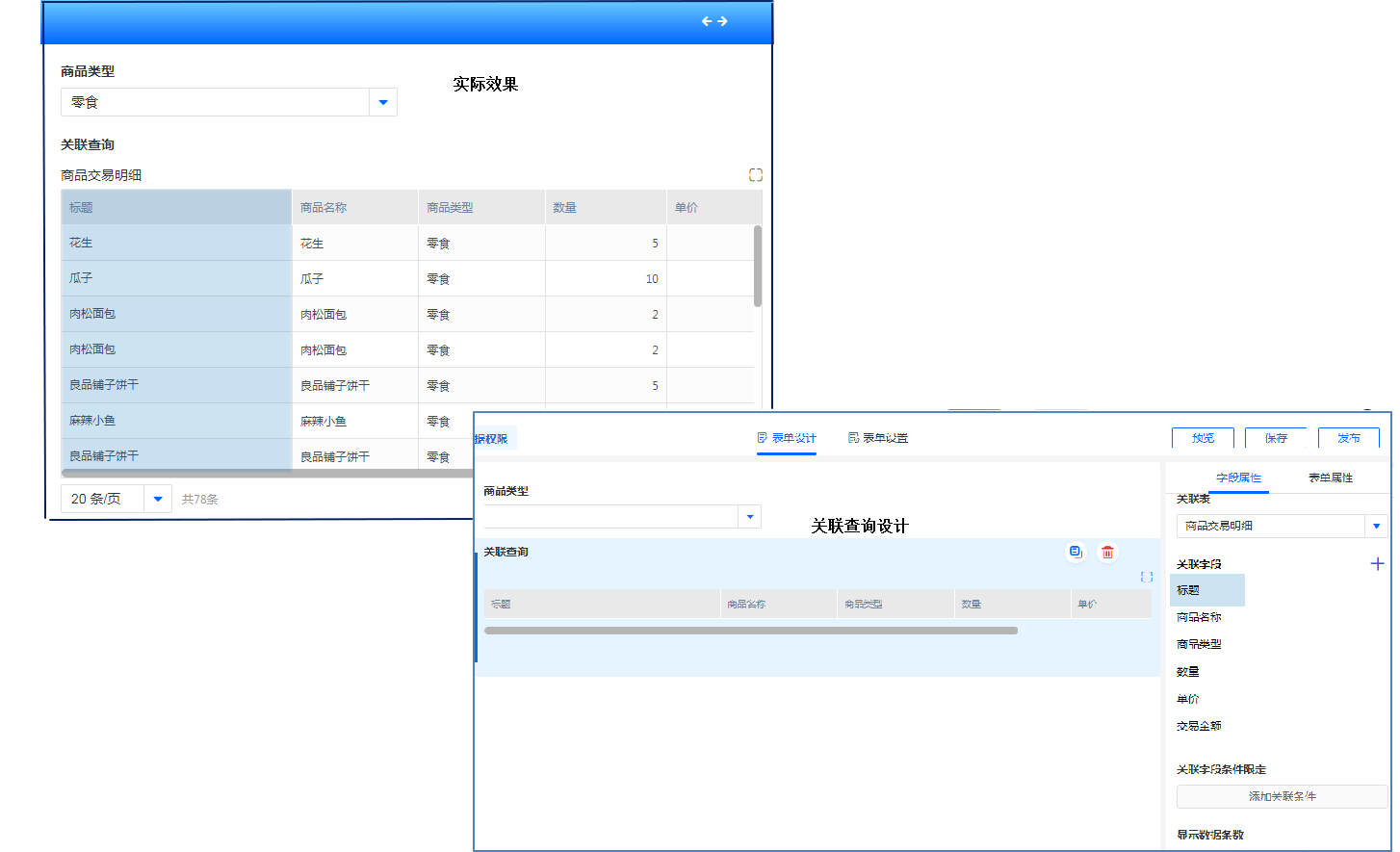 在设置关联查询或者关联数据字段时,显示字段可添加标题字段,在实际使用数据加载时,数据标题则会显示在关联查询或关联数据列表中。