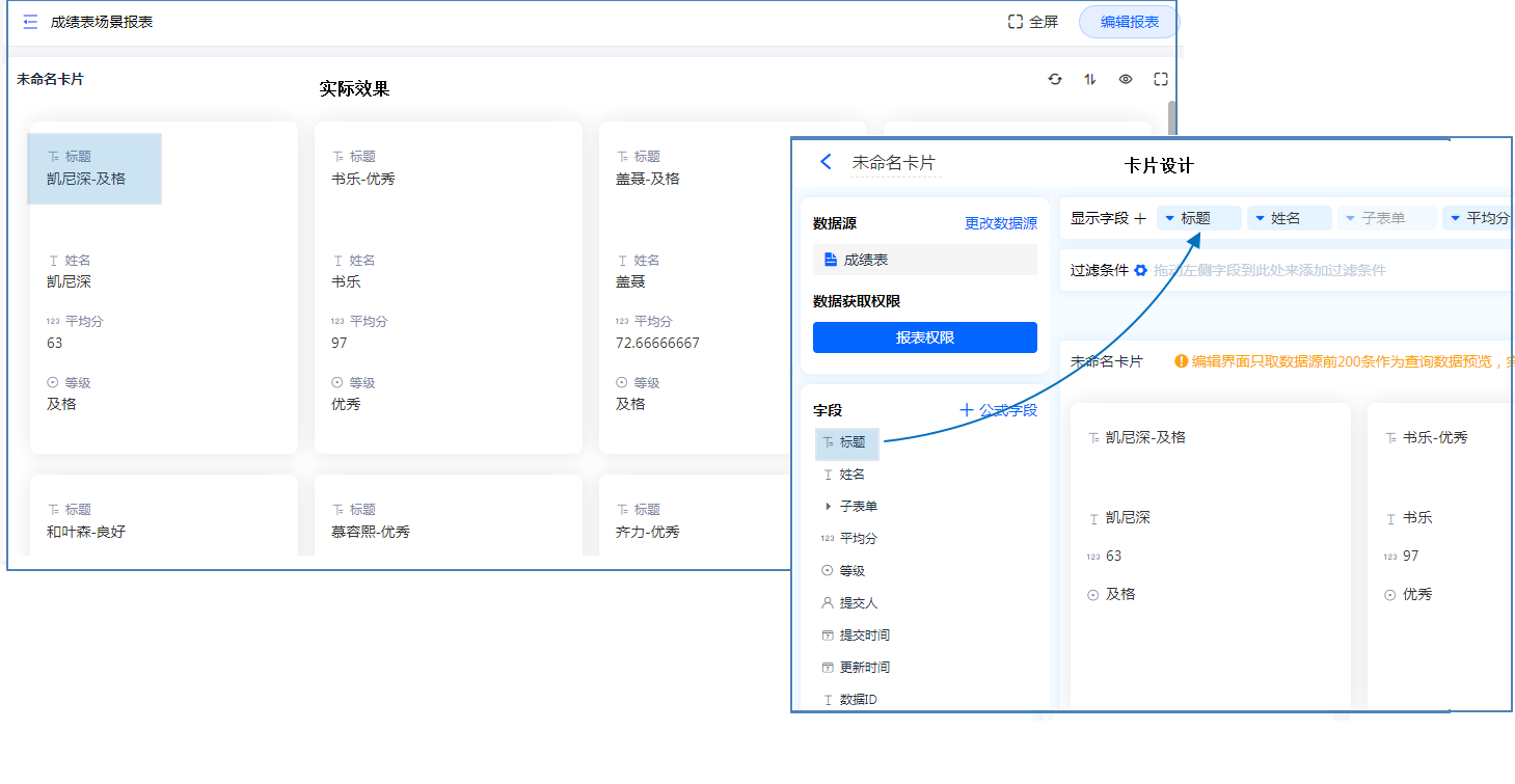 场景报表中,卡片、地图场景报表,添加数据源后,字段列表会显示标题字段,支持添加标题做显示字段。