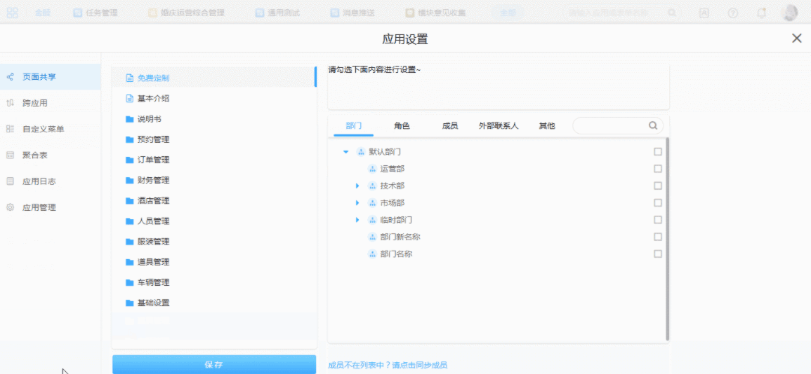 操作步骤: 【点击设置】——【页面共享】——【选择任意分组】——【勾选被共享的成员账号】