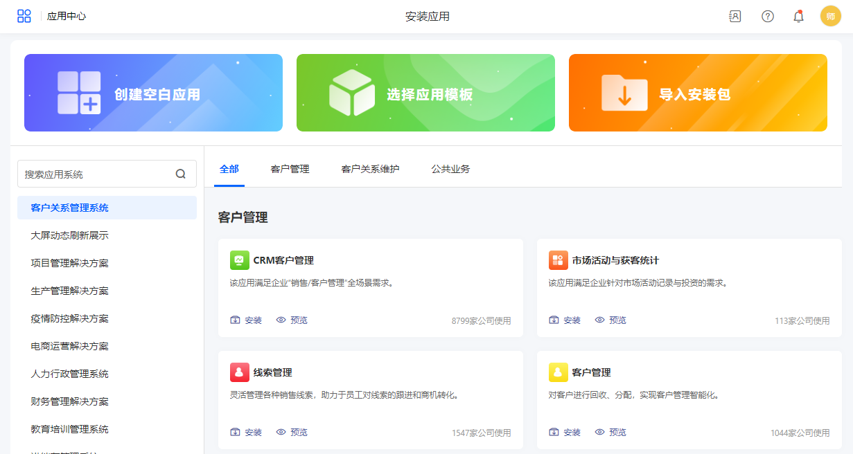 如应用中心有适合团队使用的模板,可直接通过在应用中心安装应用到工作台进行使用,安装即可投入使用。