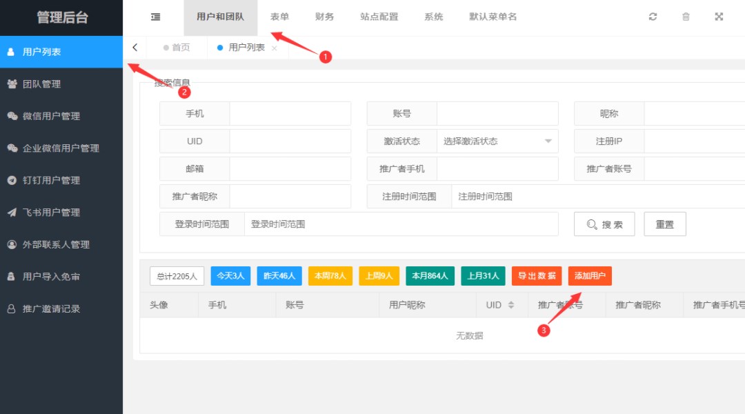 登录私有云管理后台,后台网址:https://私有云域名/admin,在用户列表->添加用户中新添加个普通账号用于客户绑定钉钉,如已经进行了短信集成也可以直接在前台进行注册