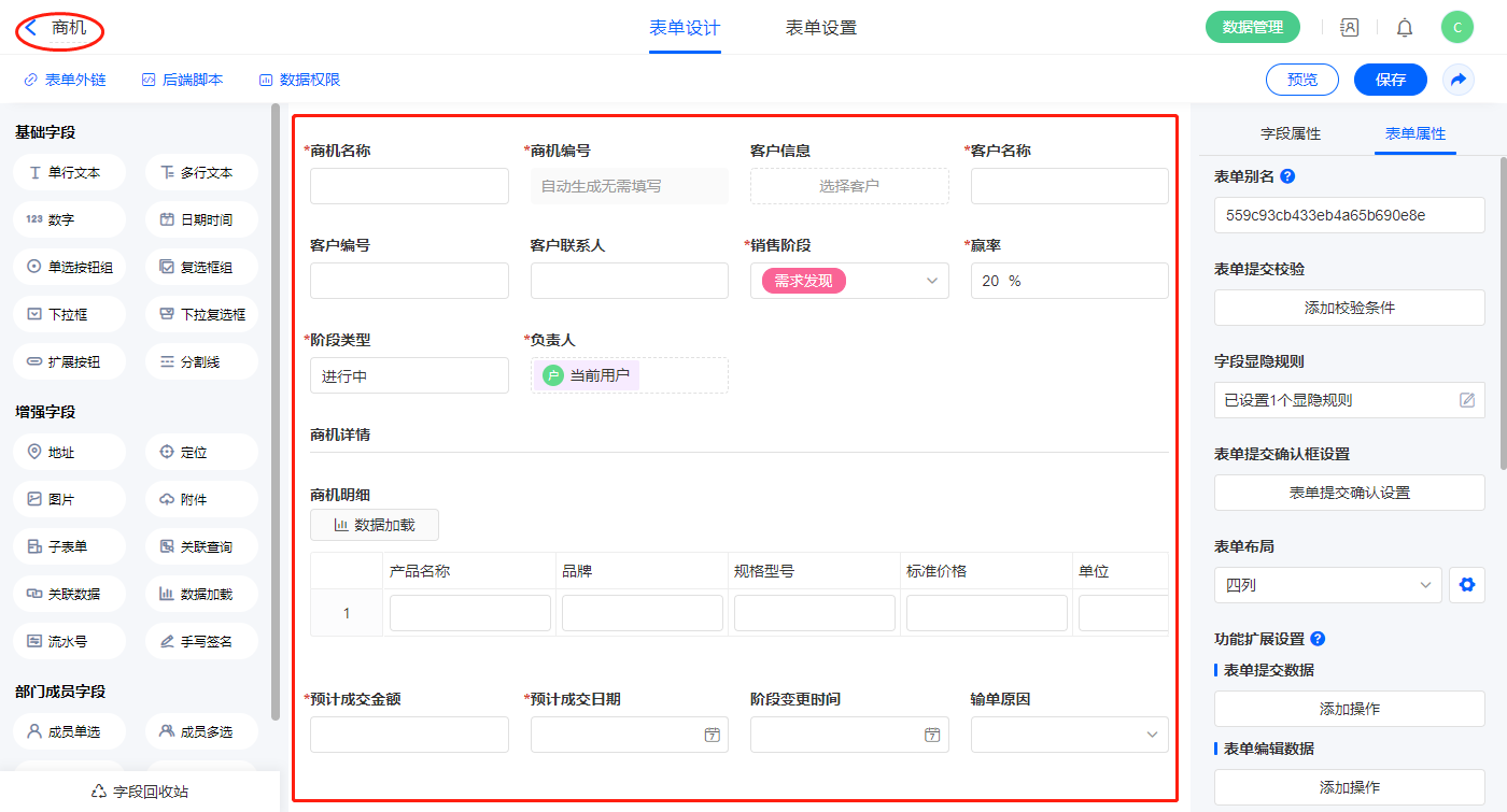 1)新增【我的商机】报表,用基础报表【数据表】展示数据源为主表【商机】的数据;