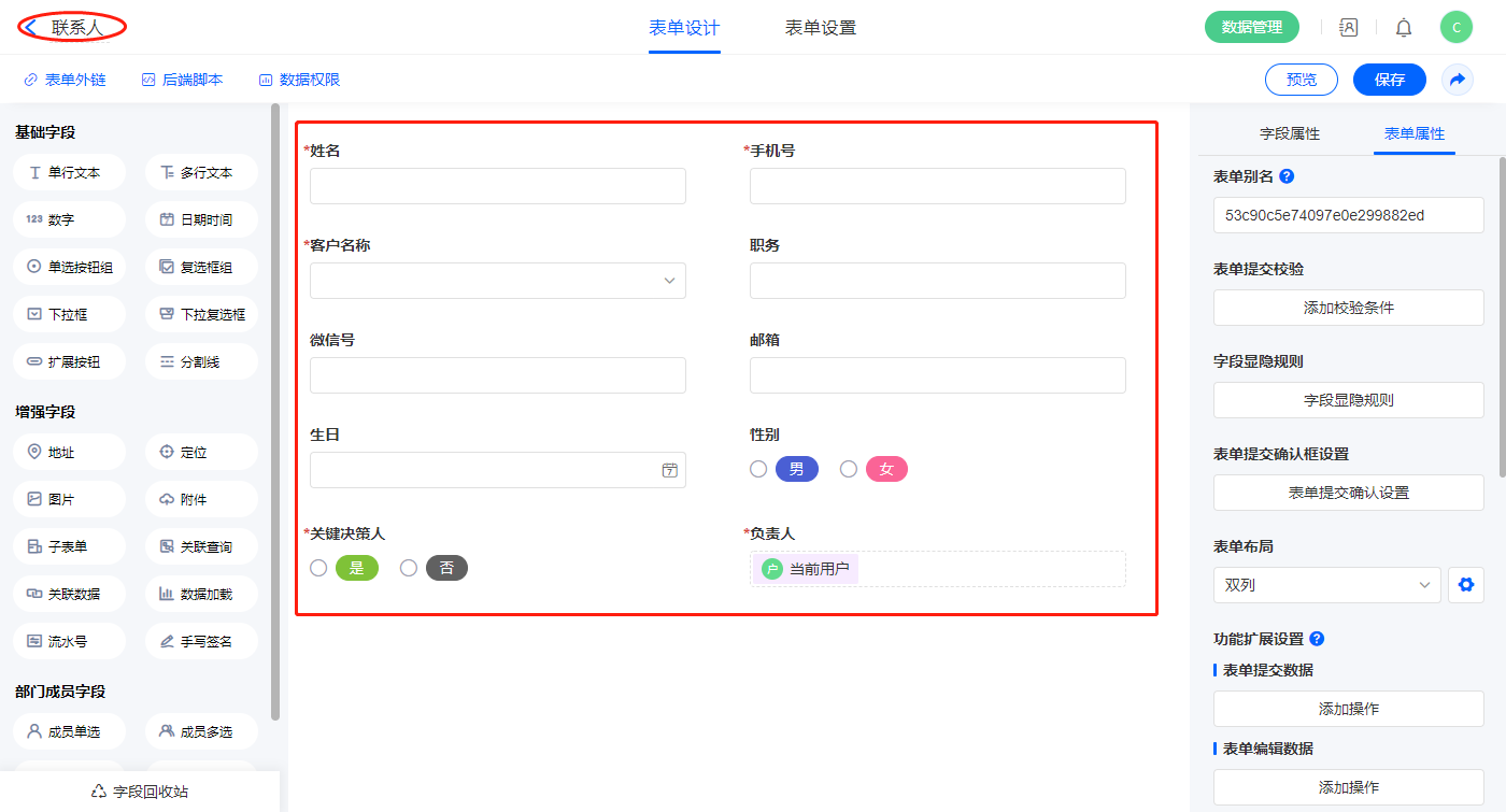 1)新增【我的联系人】报表,用基础报表【数据表】展示数据源为辅助表【联系人】的数据;
